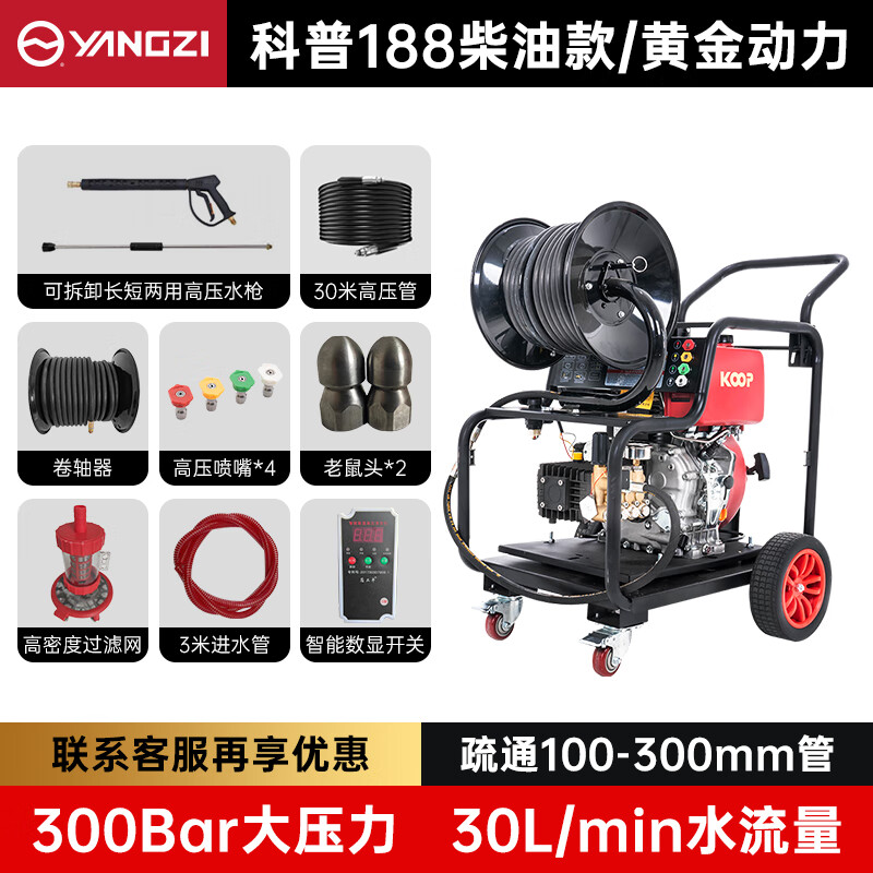 一臺揚子YZ-D30-30柴油款管道疏通機,動力強水流大暢通無阻拐彎無壓力。