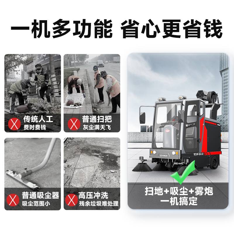 室外駕駛式掃地車掃地/吸塵/排噴,每小時清掃21000㎡,清掃寬度2100mm,續(xù)航時間4-5h,后排噴前噴霧雙功能,不用擔(dān)心滿天的灰塵。